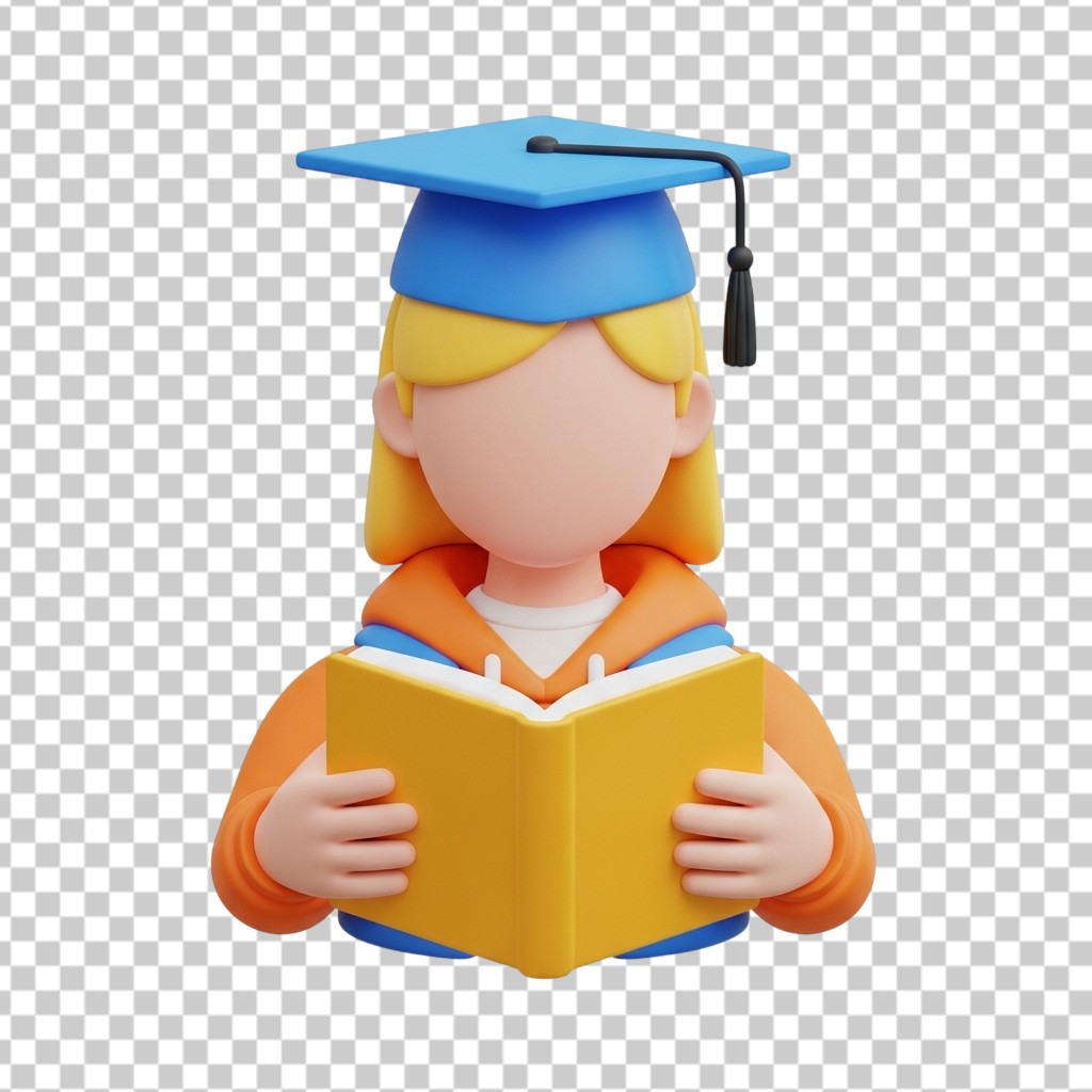 3D Female Student Character Wearing Graduation Cap and Reading Book PNG Transparent Background