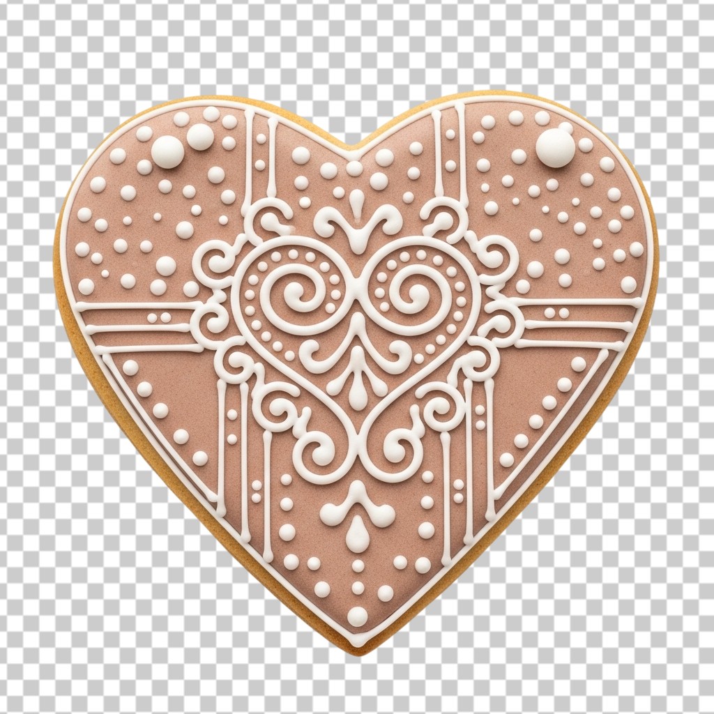 Ornate Heart Shaped Gingerbread Cookie with White Icing PNG Transparent Background