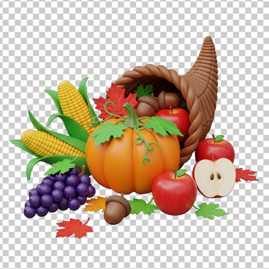 3D Thanksgiving Cornucopia Basket with Pumpkin and Fruits PNG Transparent Background
