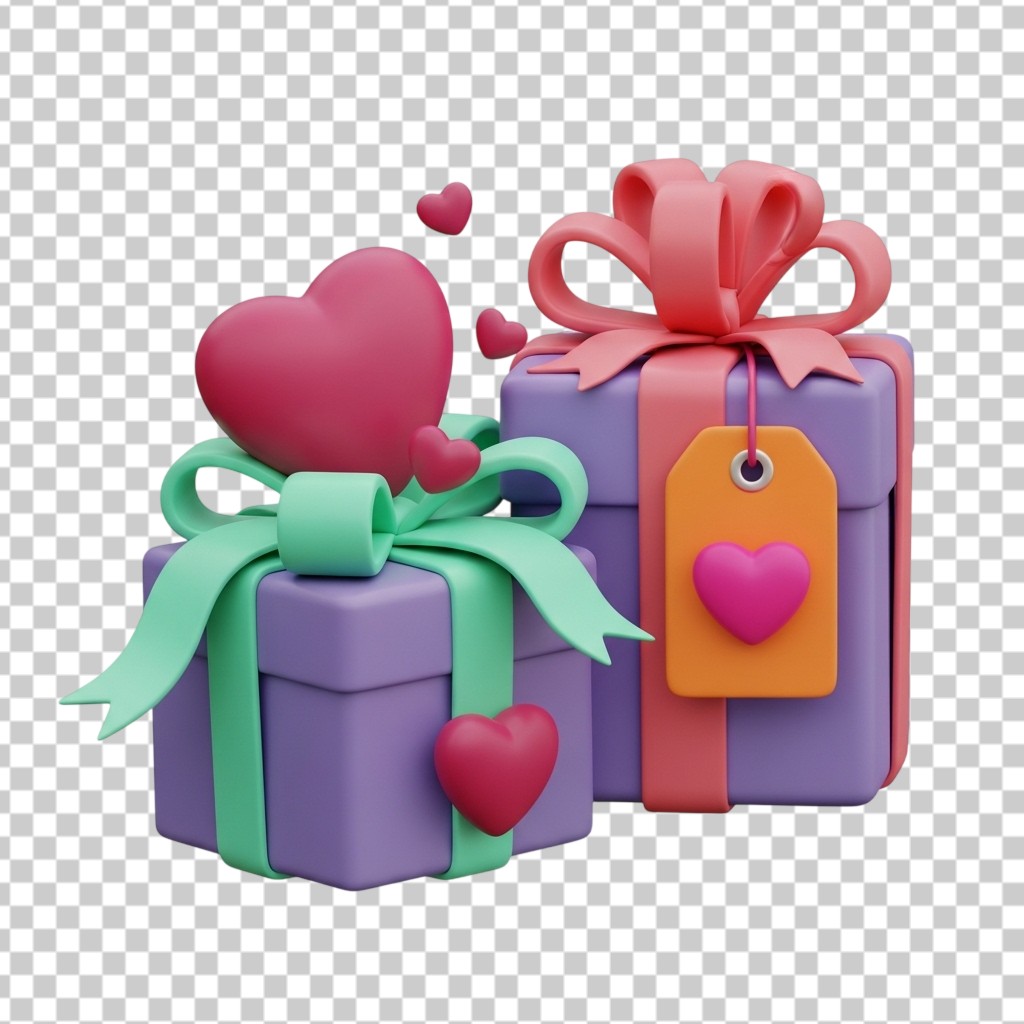 Stack of Purple Gift Boxes with Pink Bows and Hearts 3D PNG Transparent Background