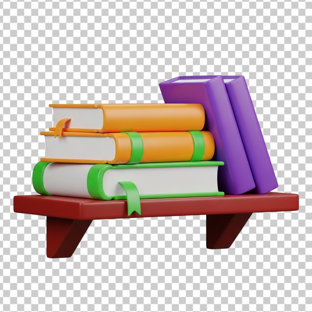 3D Stack of Colorful Books on Wooden Shelf PNG Transparent Background