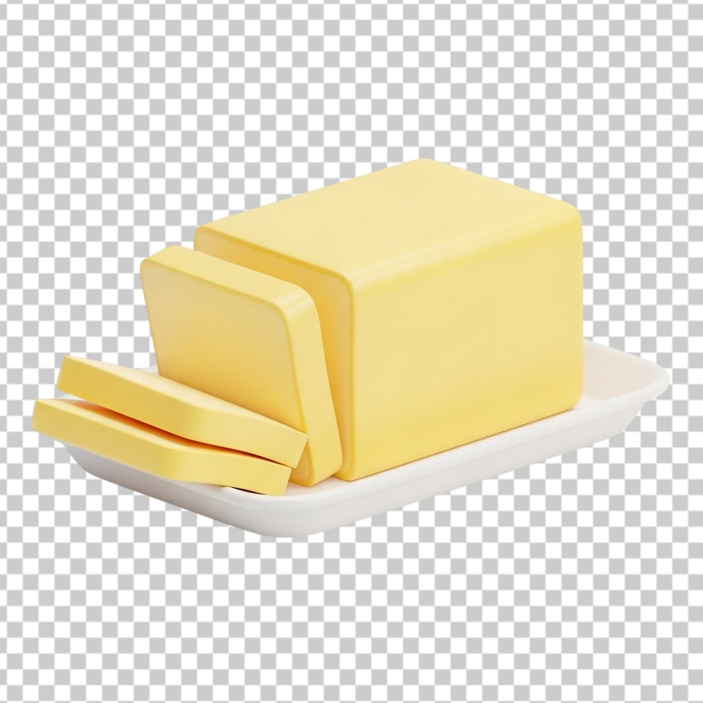 3D Sliced Block of Yellow Butter on White Plate PNG Transparent Background