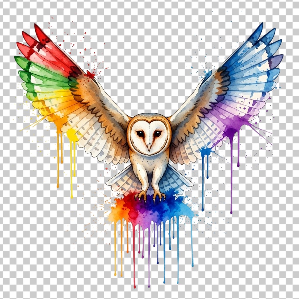 Artistic Watercolor Owl with Colorful Spattered Wings PNG Transparent Background