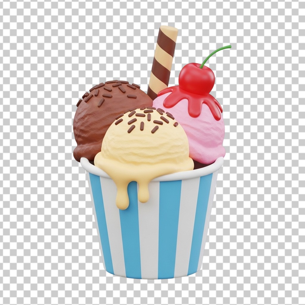 3D Delicious Ice Cream Sundae in Striped Cup PNG Transparent Background