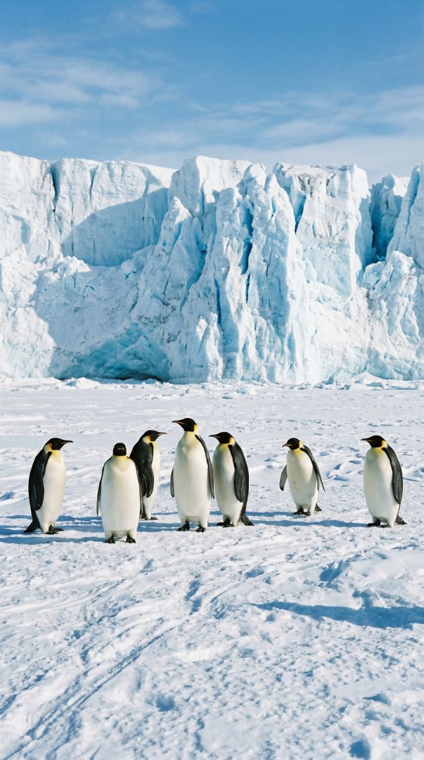 Emperor Penguins on Frozen Landscape with Huge Ice Cliffs