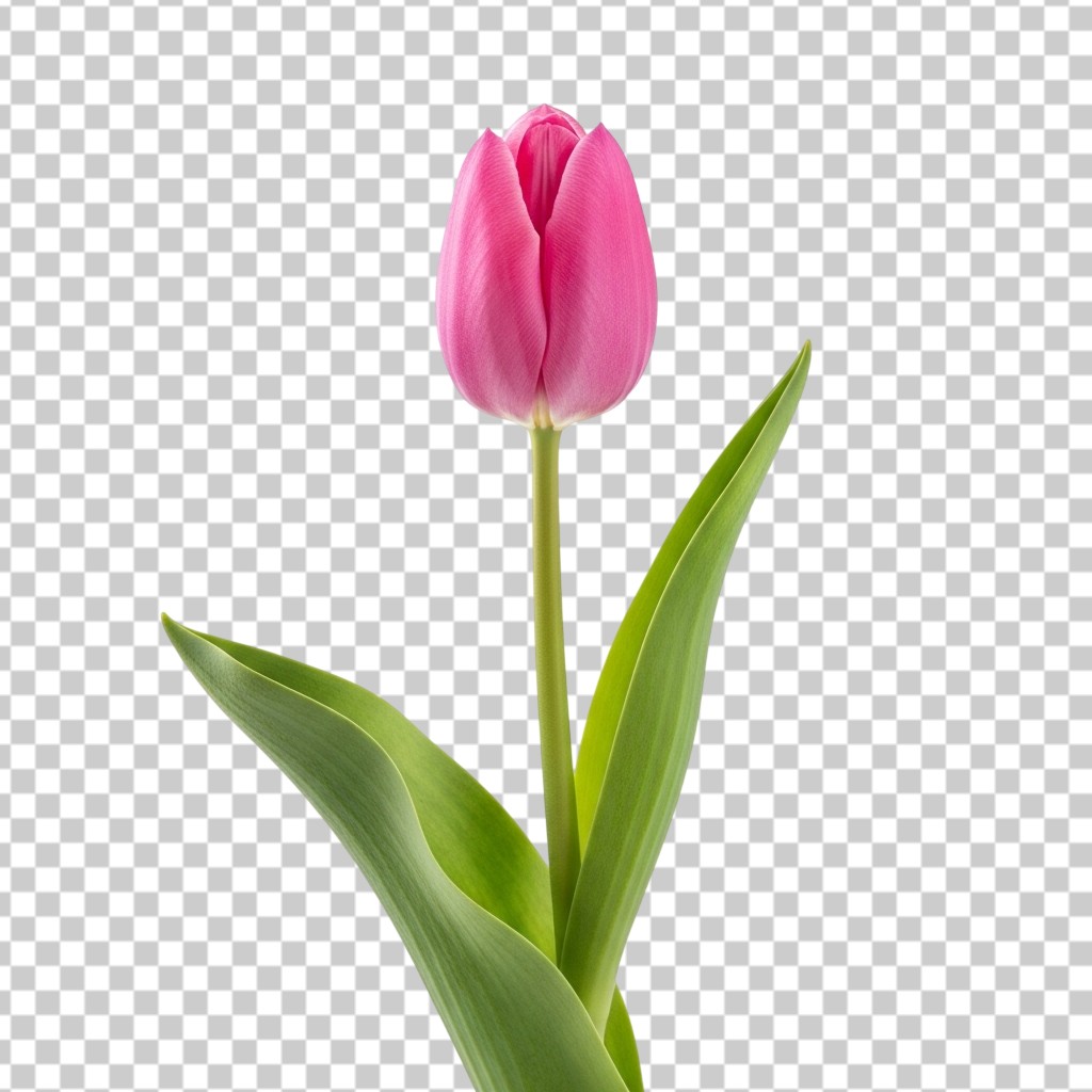 Fresh Single Pink Tulip Flower with Green Stem and Leaf PNG Transparent Background
