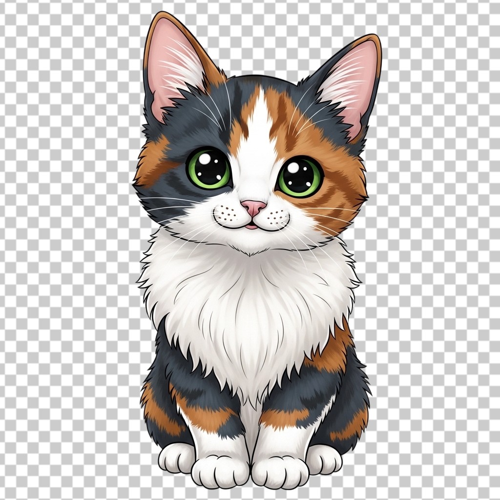 Cute Illustrated Calico Kitten with Big Green Eyes PNG Transparent Background