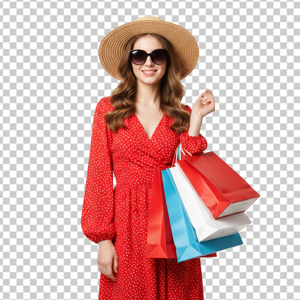 Fashionable Young Woman in Red Dress Wearing Hat and Carrying Shopping Bags PNG Transparent Background
