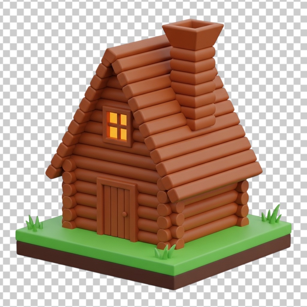 3D Isometric Wooden Log Cabin in Forest Setting PNG Transparent Background