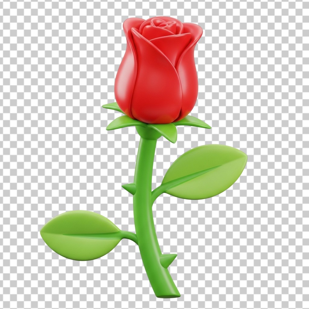 3D Red Rose Flower with Green Stem and Leaves Icon PNG Transparent Background