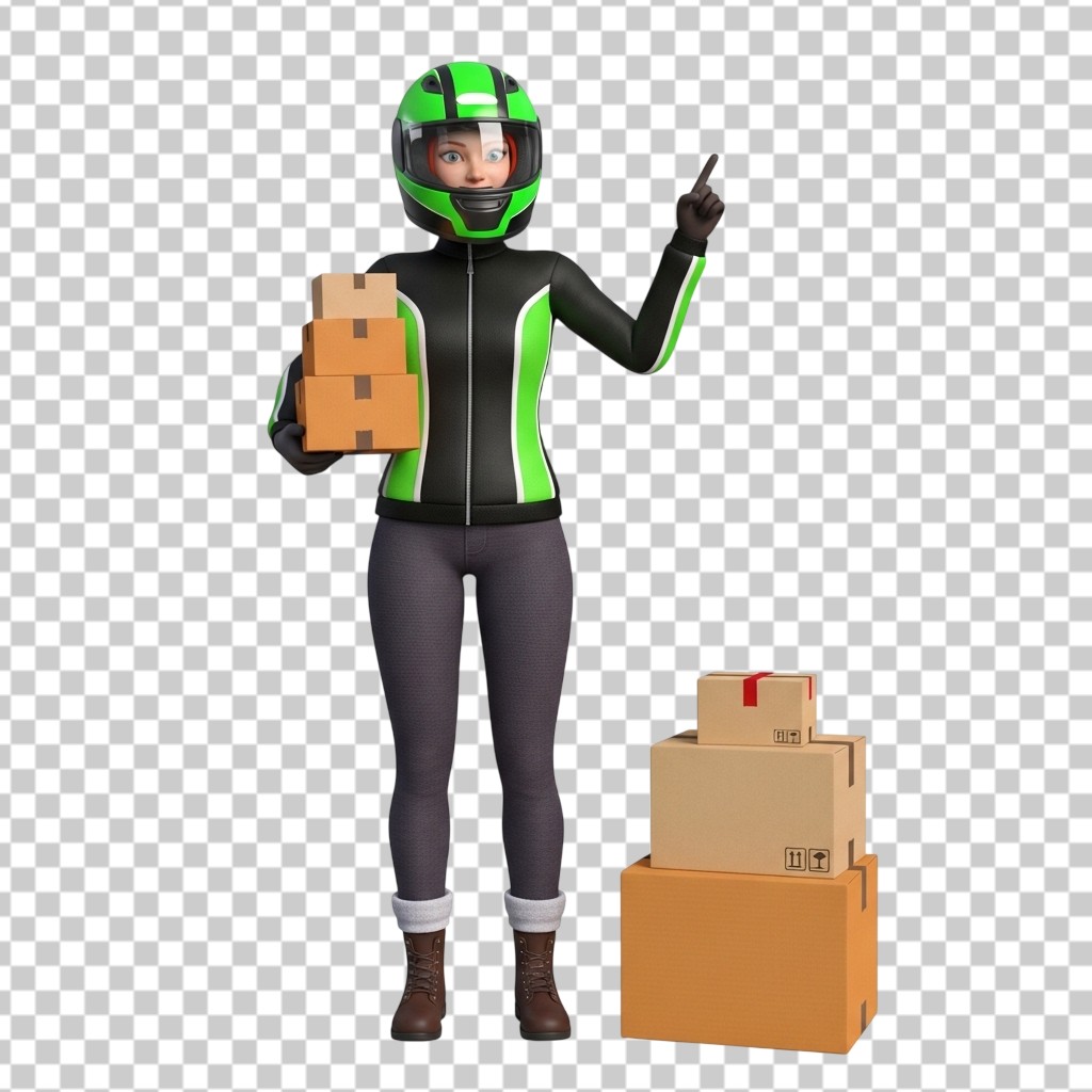 3D Delivery Woman Character Avatar with Cardboard Boxes PNG Transparent Background