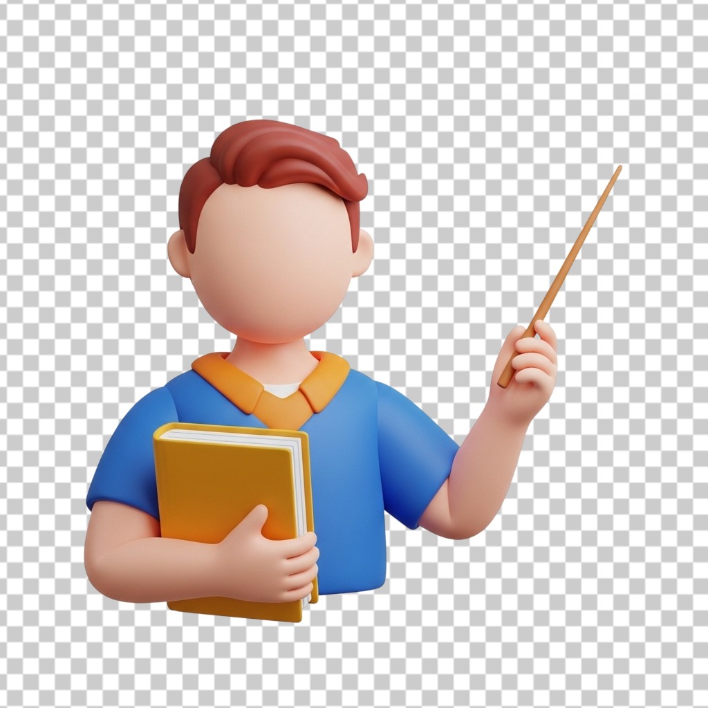 Male Teacher Character with Book and Pointer 3D PNG Transparent Background