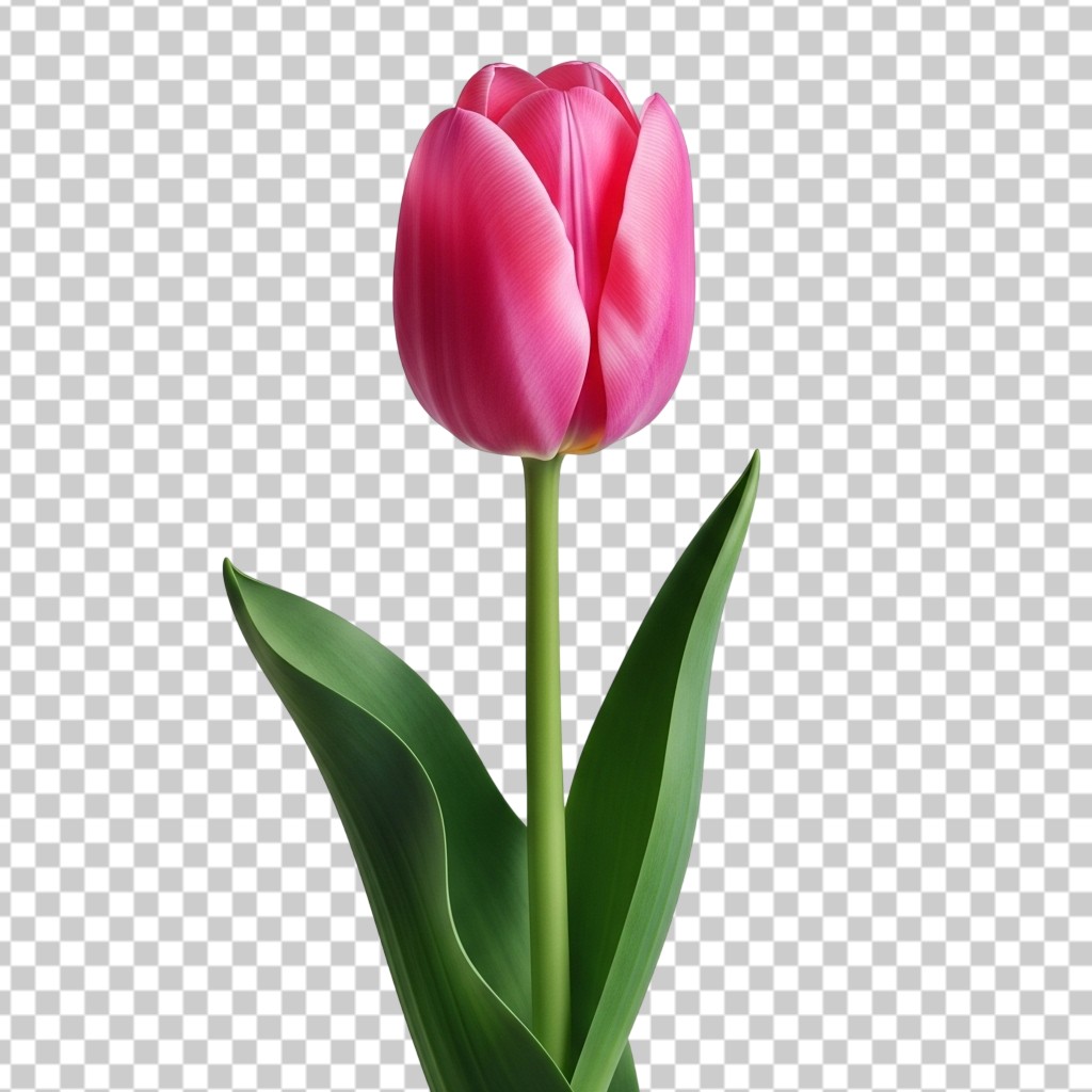 Single Elegant Pink Tulip Flower with Green Leaves PNG Transparent Background