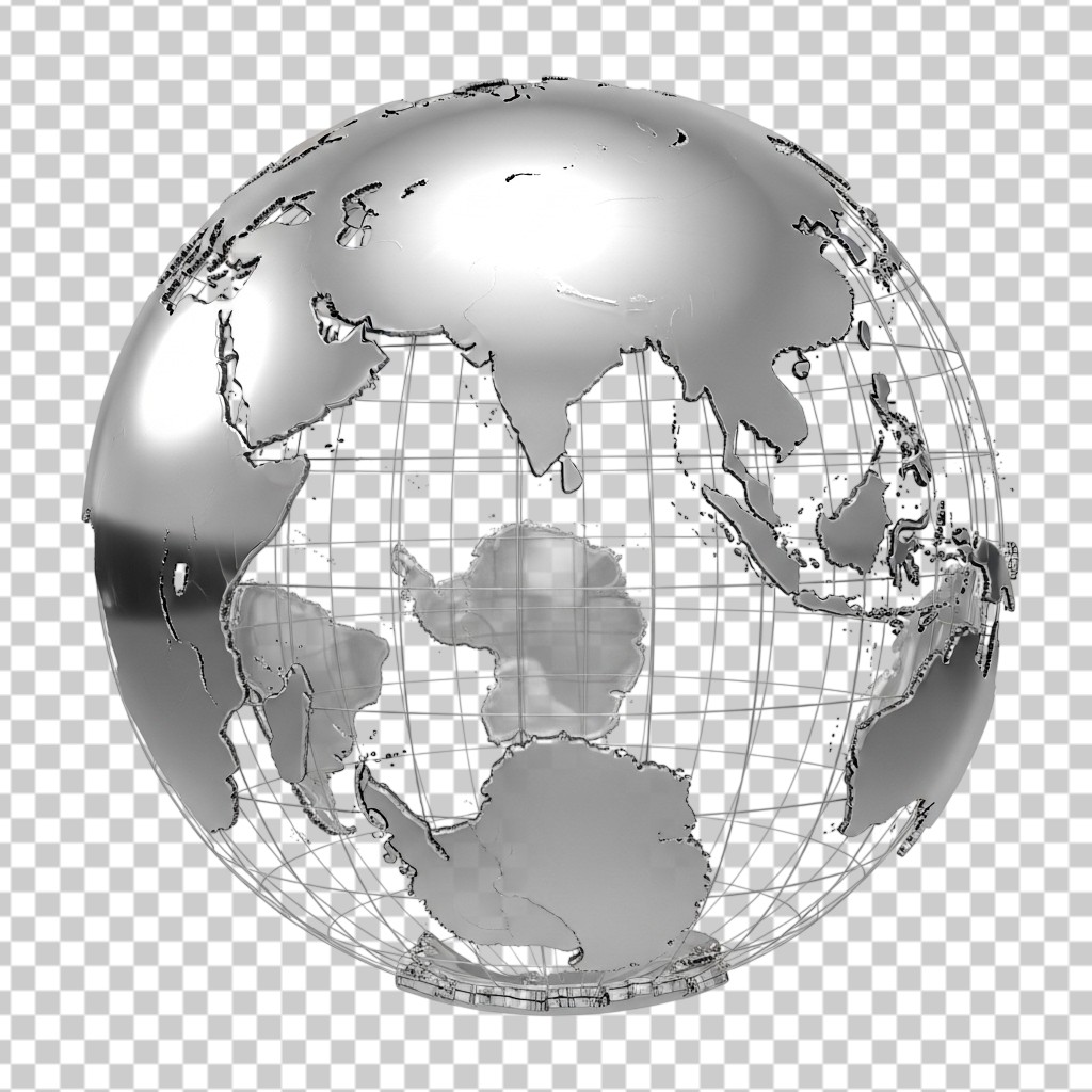 3D Metallic Silver Earth Globe Showing Continents PNG Transparent Background