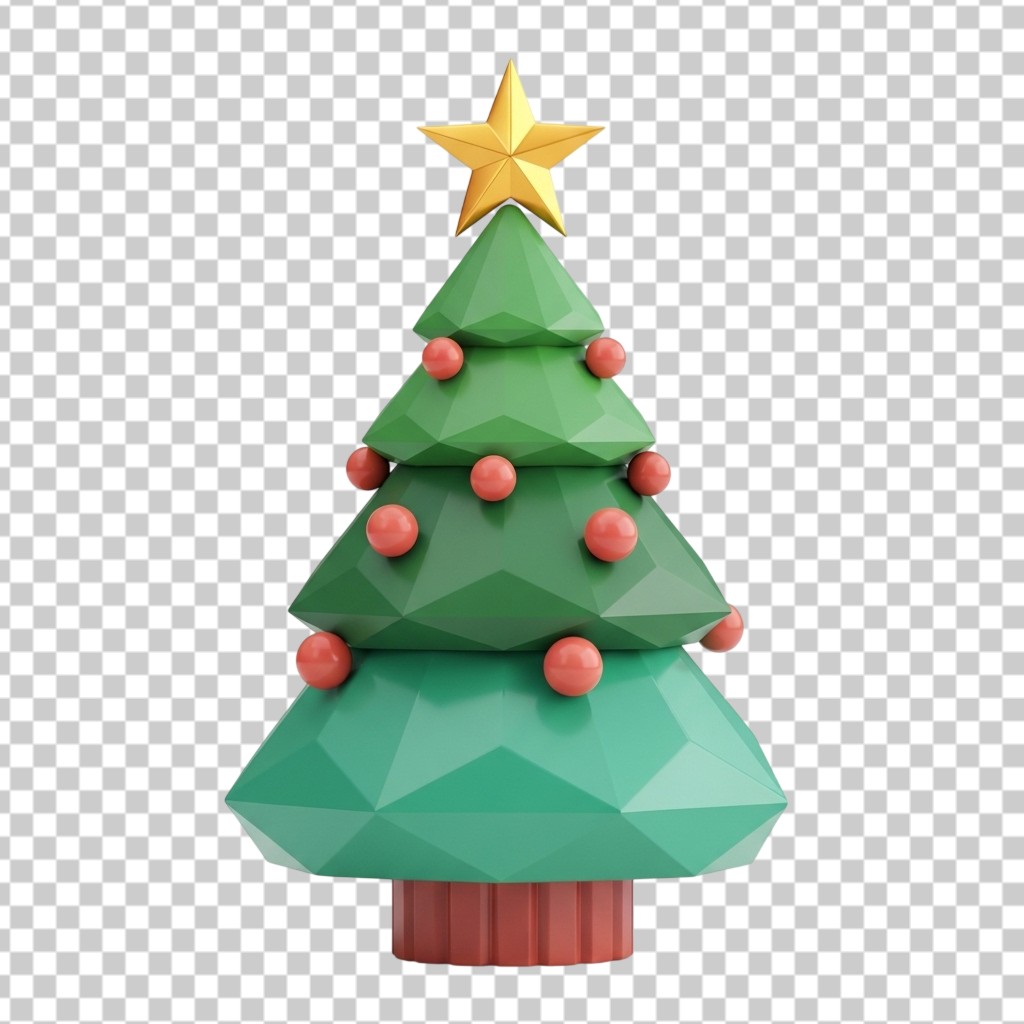 Stylized 3D Low Poly Green Christmas Tree with Golden Star PNG Transparent Background