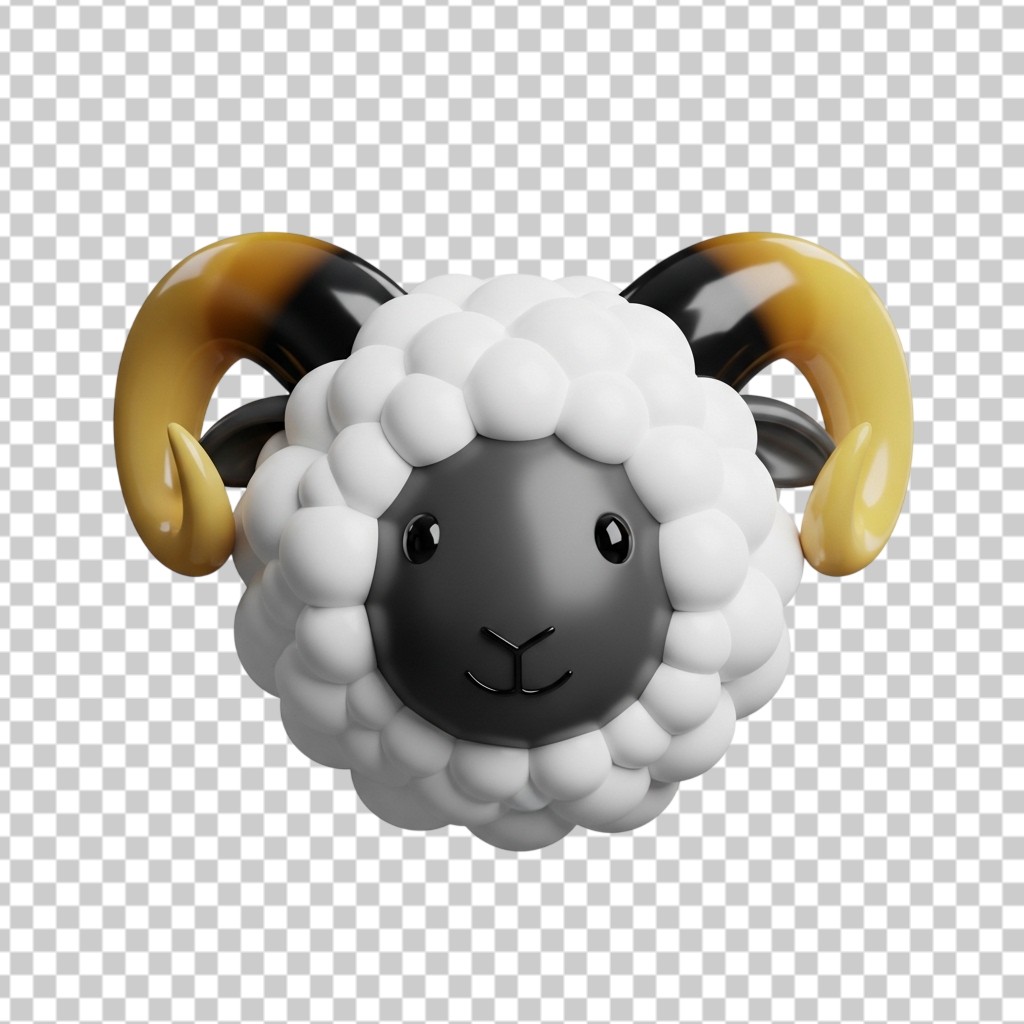 3D Sheep Head Avatar with Large Curved Horns Cute Farm Animal Character PNG Transparent Background