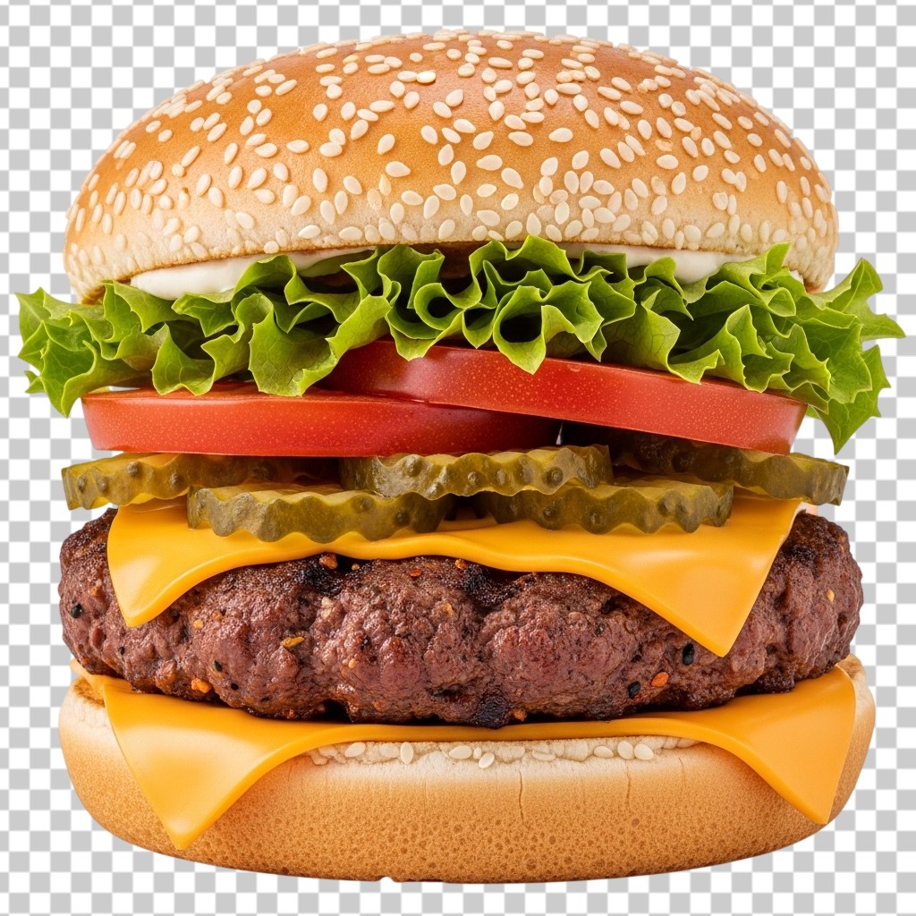 Large Gourmet Cheeseburger with Fresh Lettuce Tomato and Pickles PNG Transparent Background