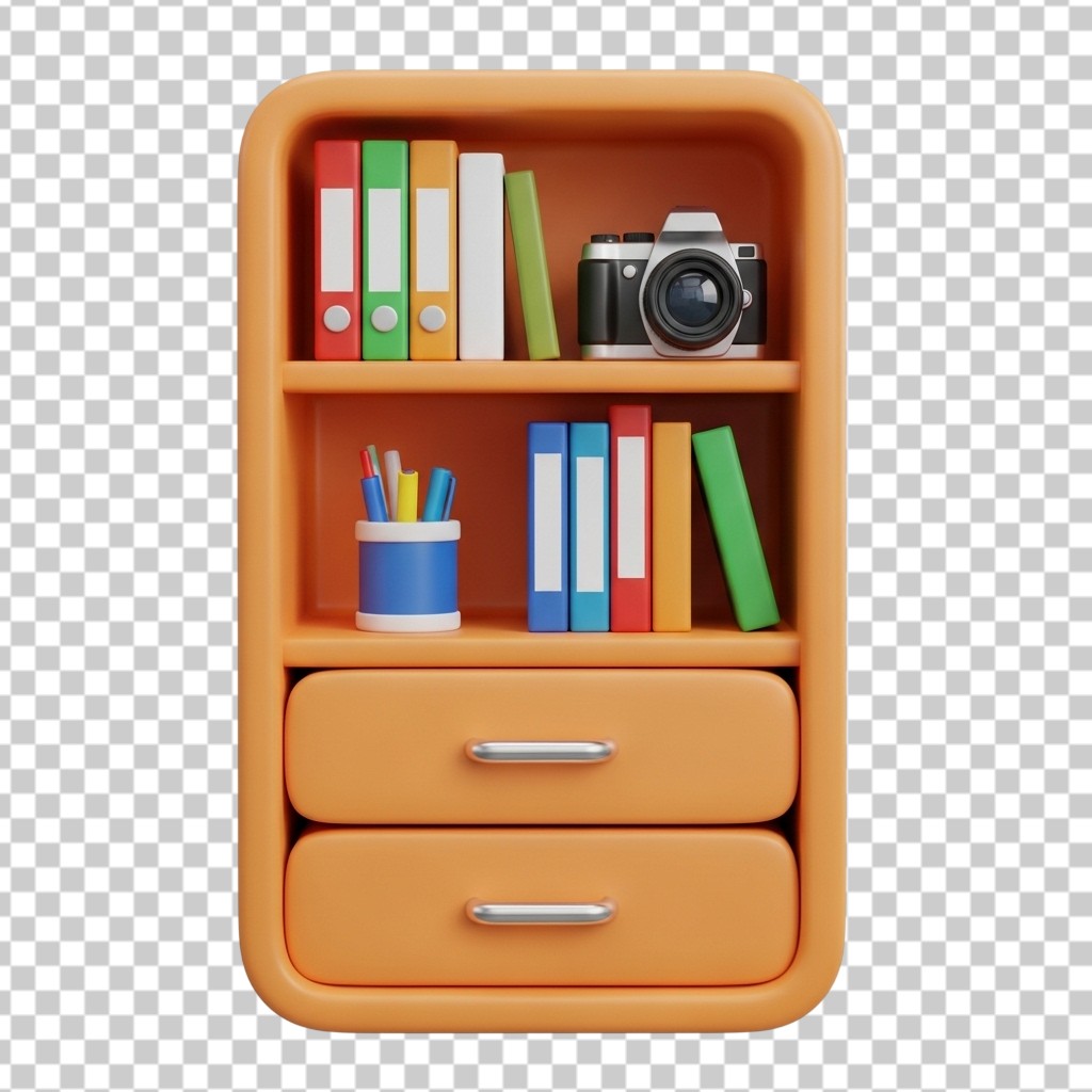 3D Small Wooden Office Cabinet with Files and Camera PNG Transparent Background