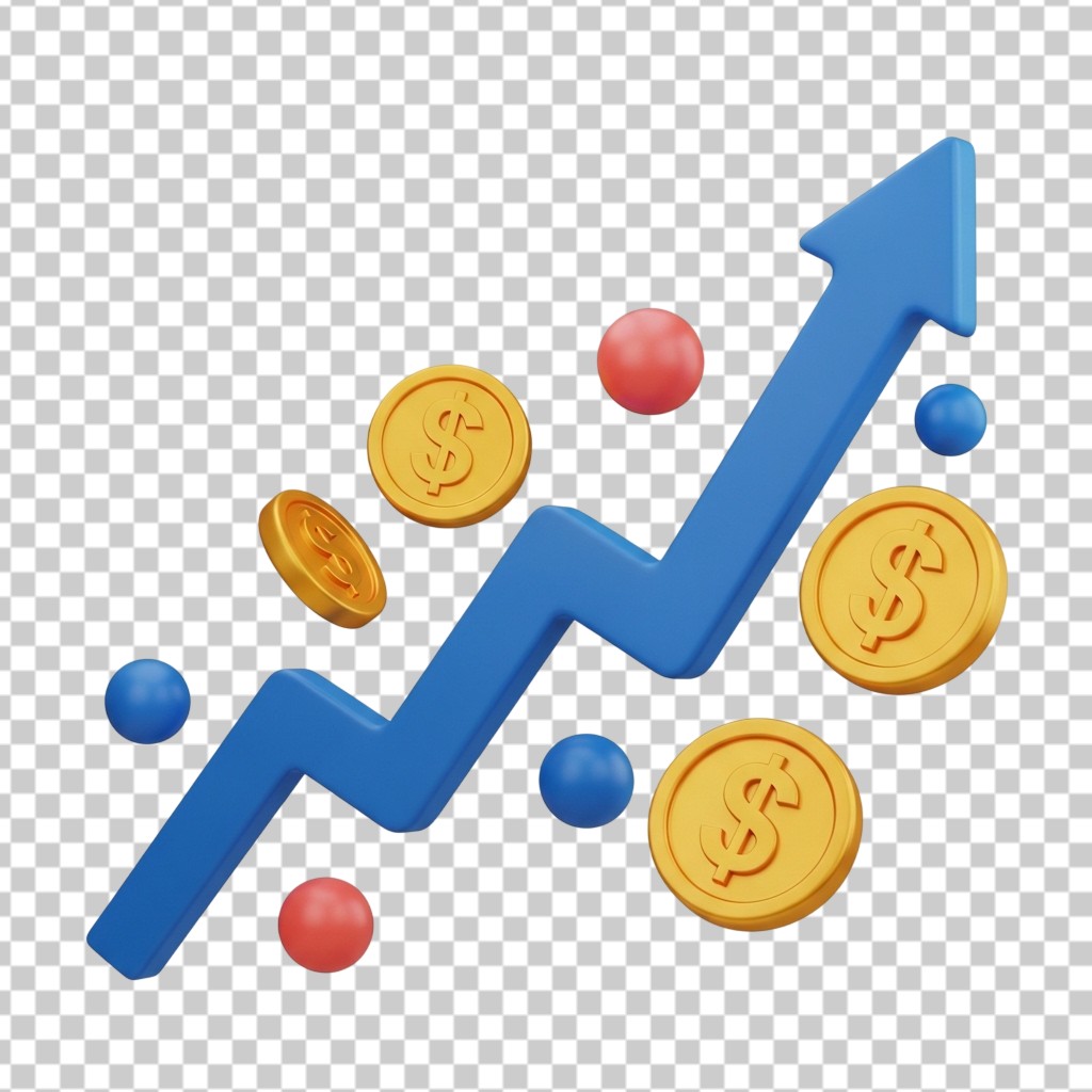 3D Blue Growth Arrow with Floating Golden Coins for Stock Market and Finance Success PNG Transparent Background