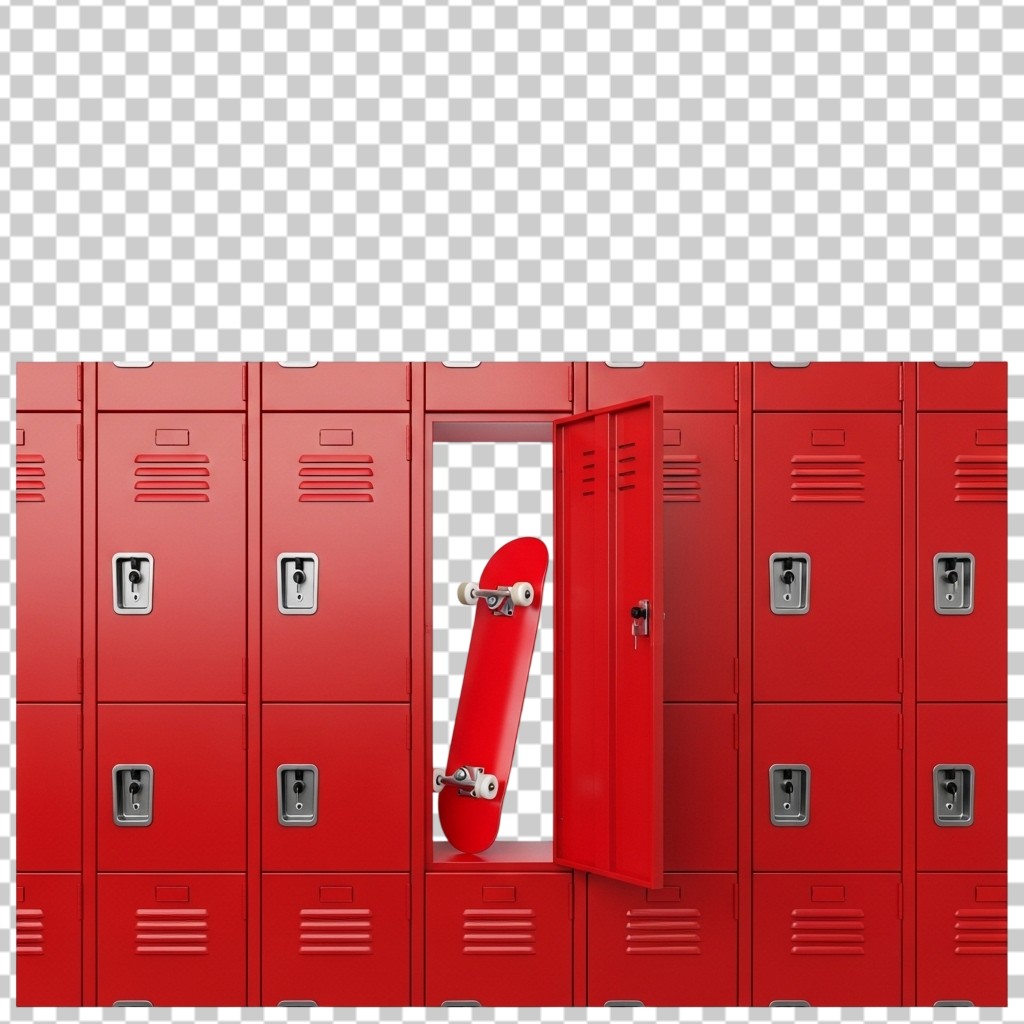 Row of Red School Lockers with Skateboard PNG Transparent Background