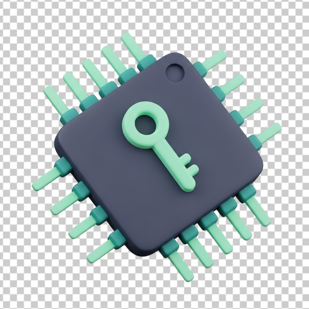 Cyber Security CPU Chip with Key Icon 3D PNG Transparent Background