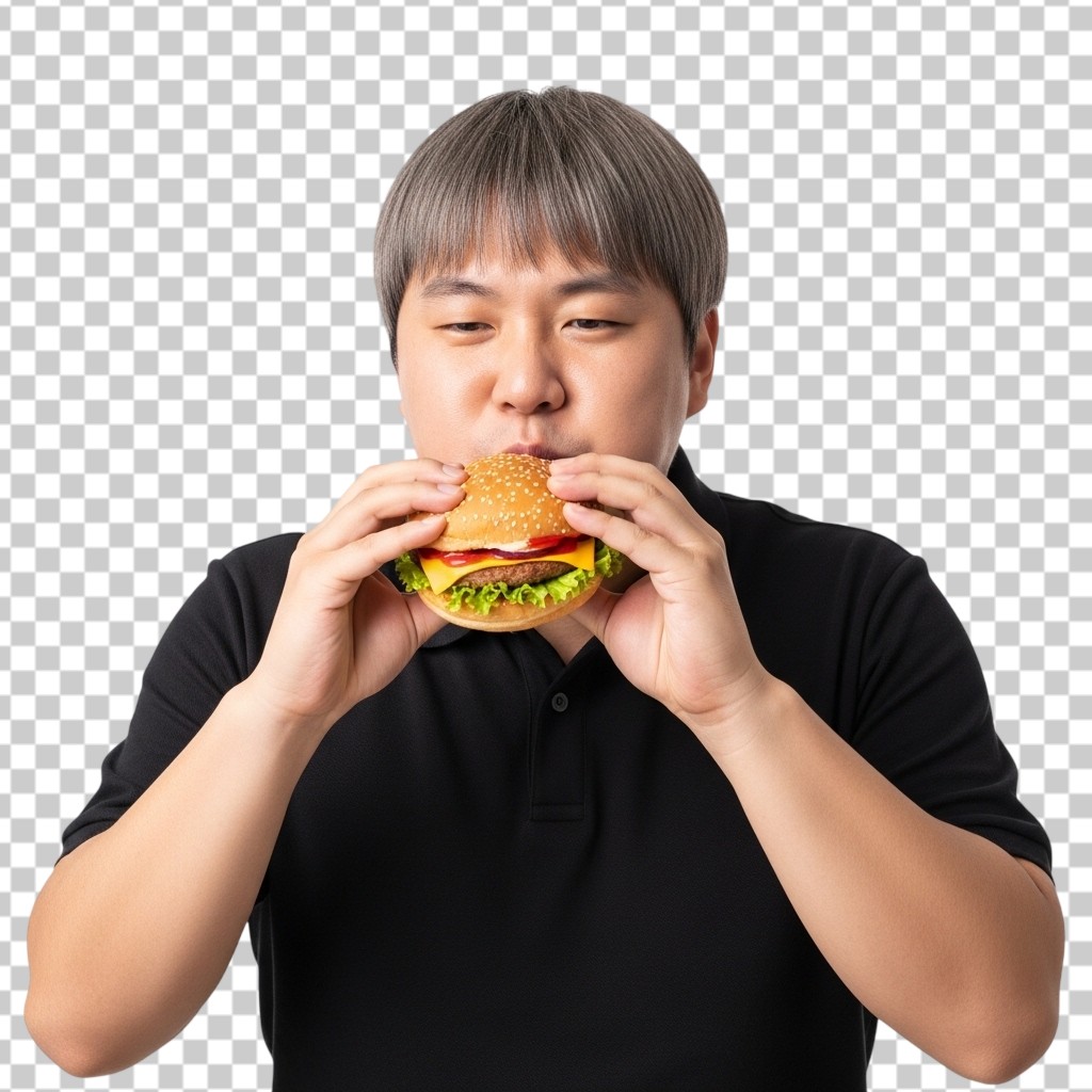 Man Enjoying Eating a Large Juicy Burger with Fast Food PNG Transparent Background