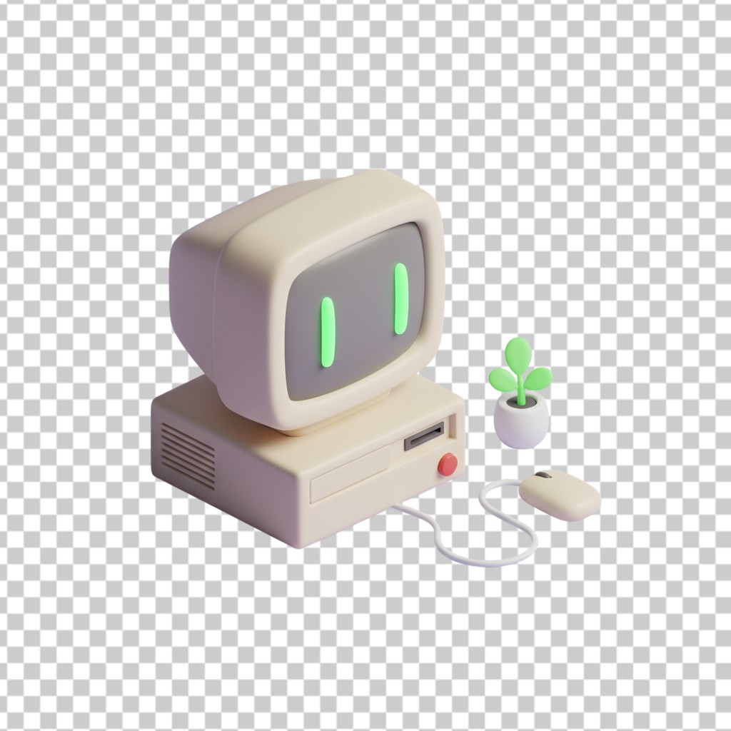 3D Retro Classic Desktop Computer and Plant PNG Transparent Background