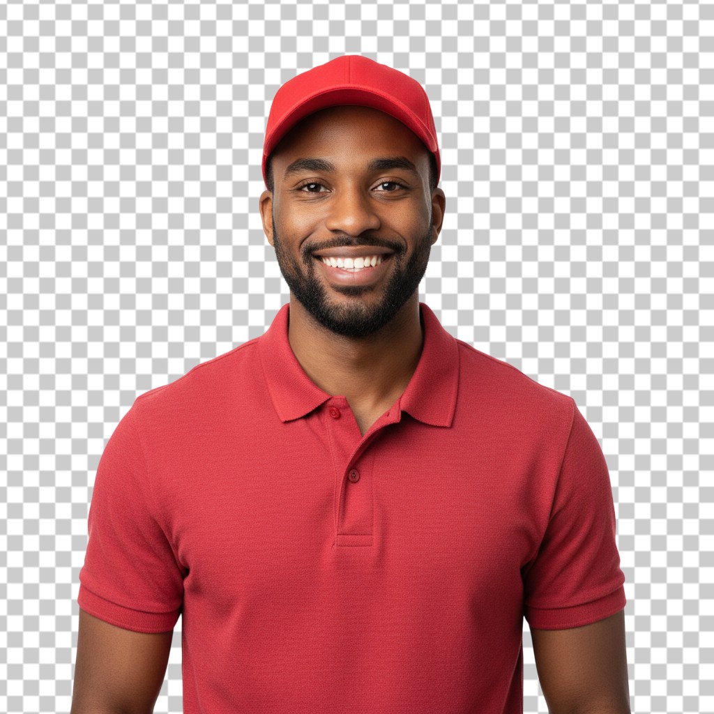 Portrait of a smiling delivery man in red uniform PNG Transparent Background,Professionals,Business People