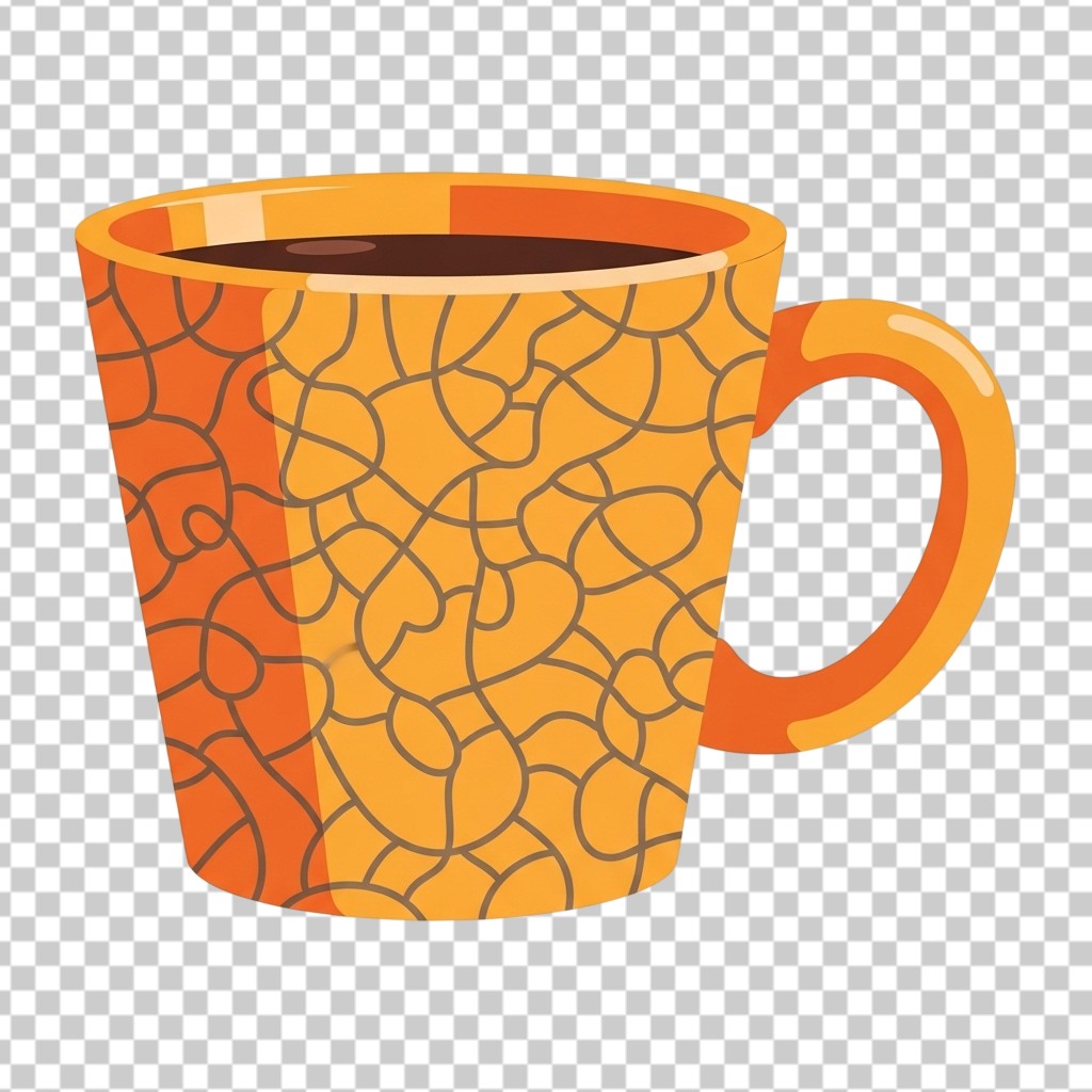 Vibrant Orange Ceramic Coffee Mug with Intricate Stylized Cracked Texture Pattern PNG Transparent Background