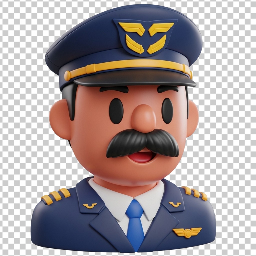 3D Professional Airline Pilot Character with Captain Hat and Mustache PNG Transparent Background