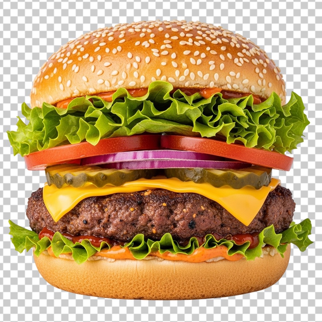 Gourmet Beef Burger with Fresh Lettuce Tomato Cheese and Onion PNG Transparent Background