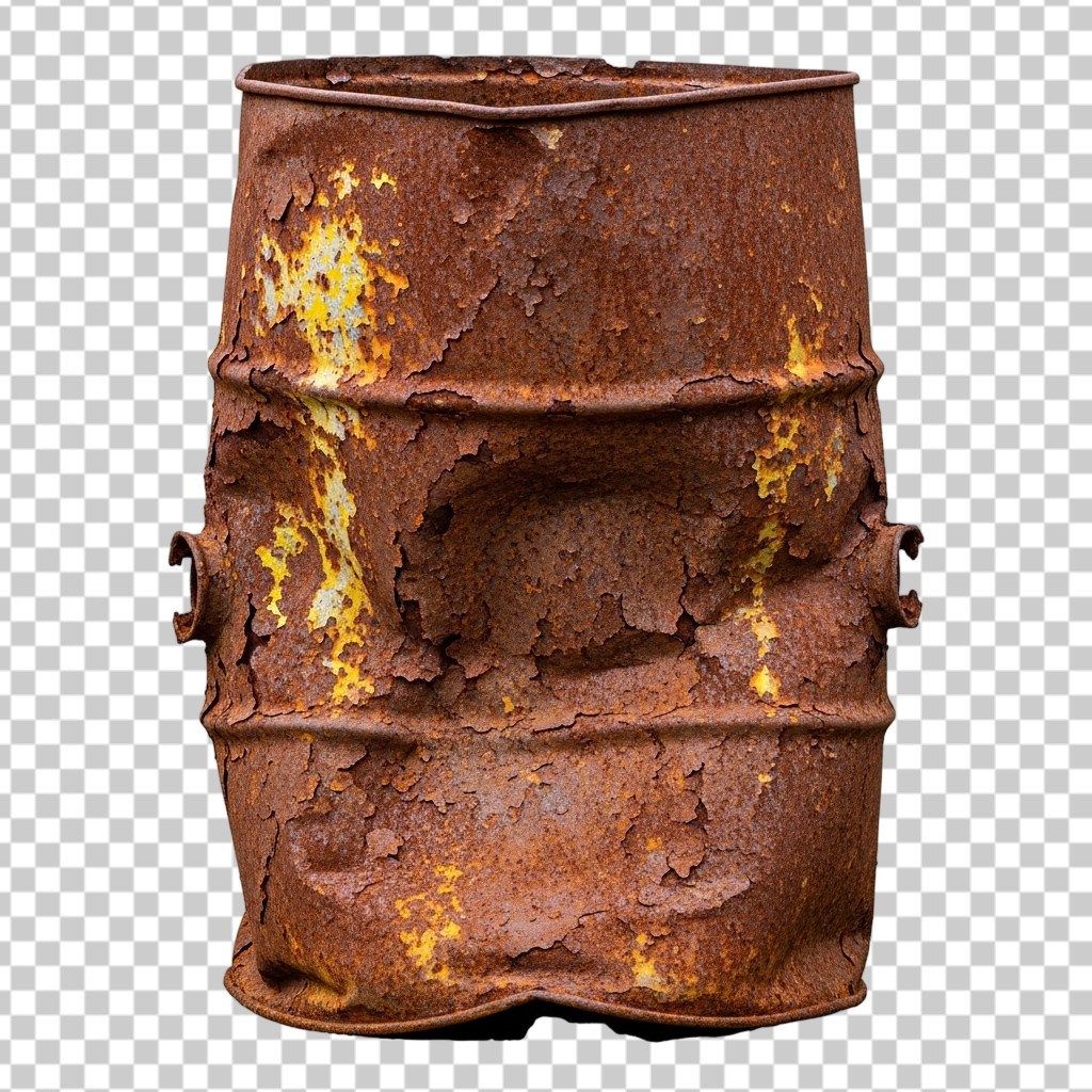 Heavily Rusted and Dented Old Metal Industrial Barrel PNG Transparent Background