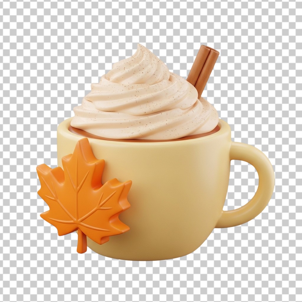 Fall Themed Hot Drink with Whipped Cream and Maple Leaf 3D PNG Transparent Background