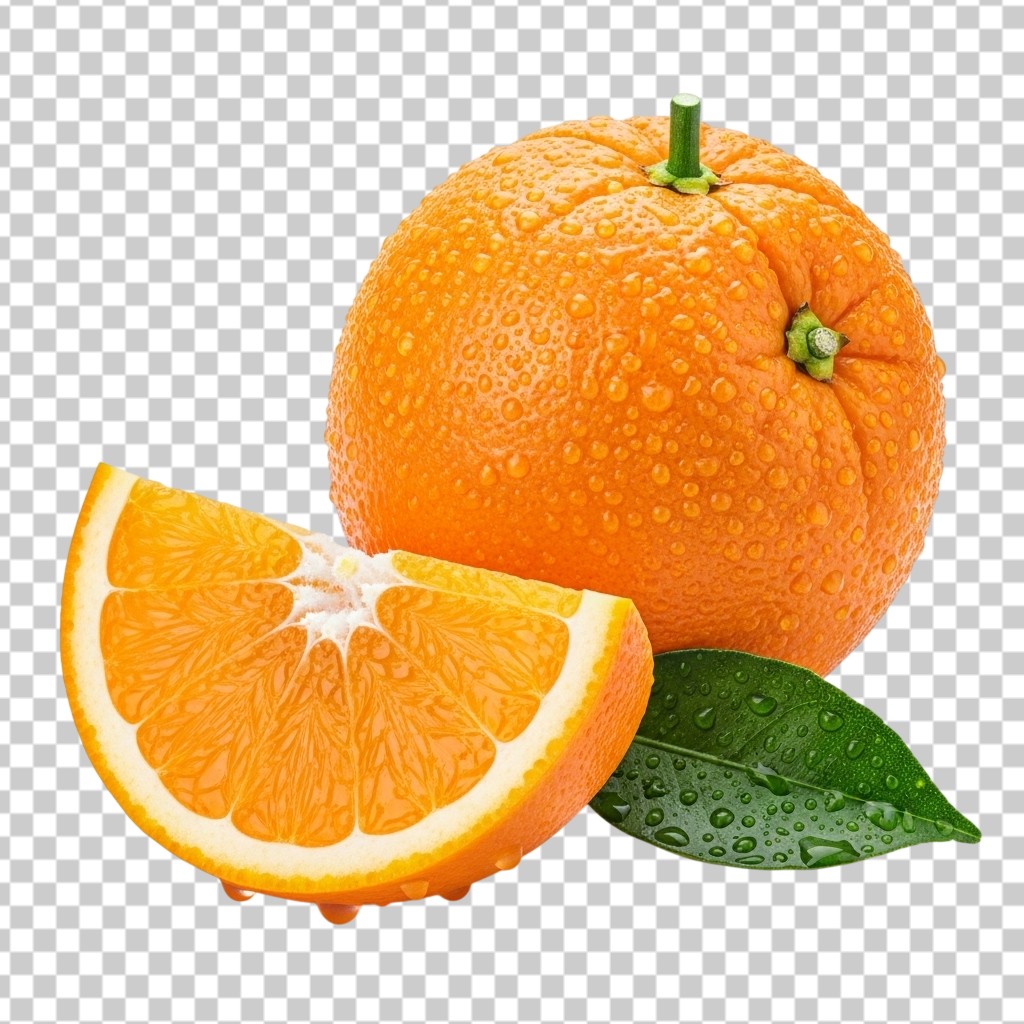 Whole Orange and Fresh Slices with Green Leaves PNG Transparent Background