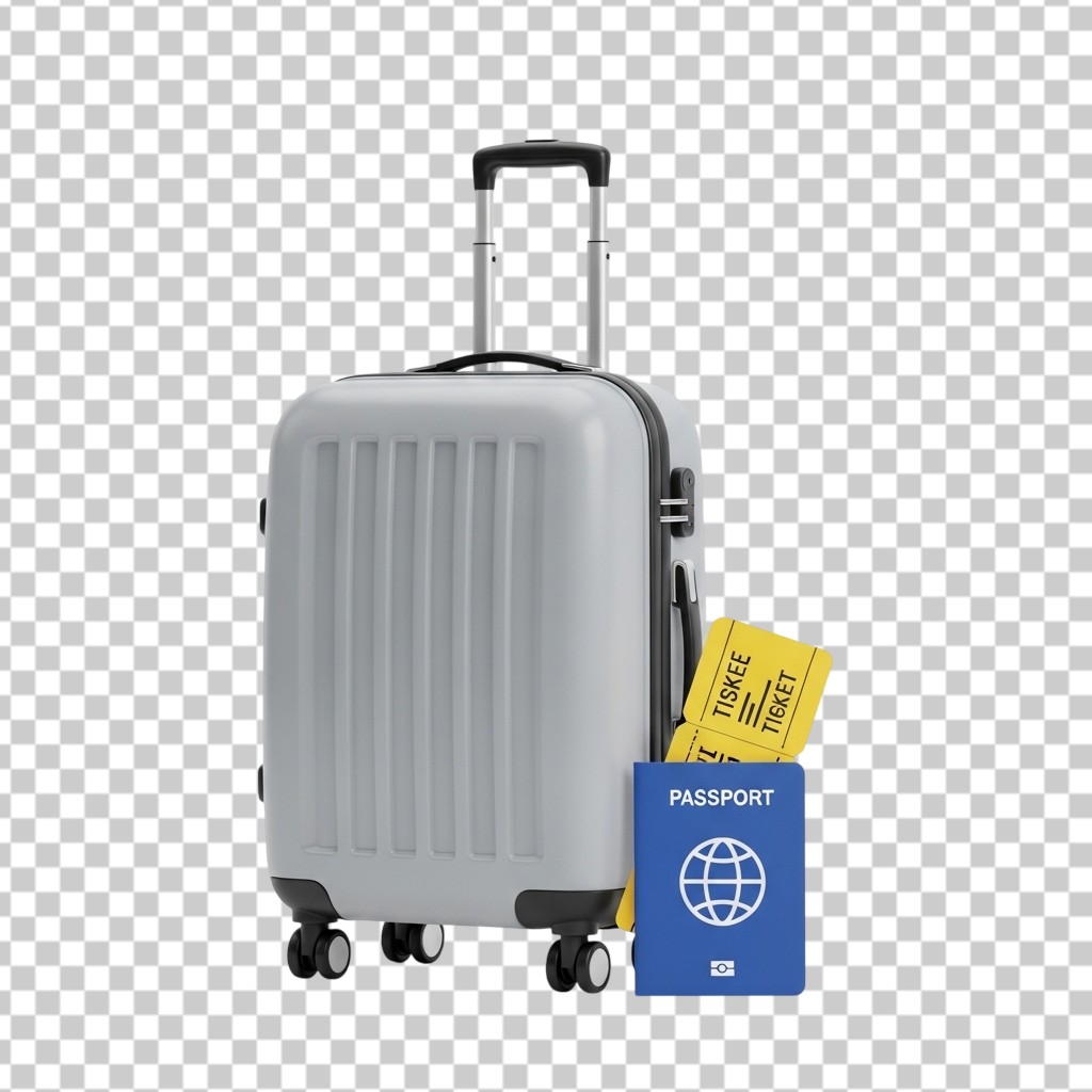Grey Travel Suitcase with Passport and Boarding Passes for Flight Travel PNG Transparent Background