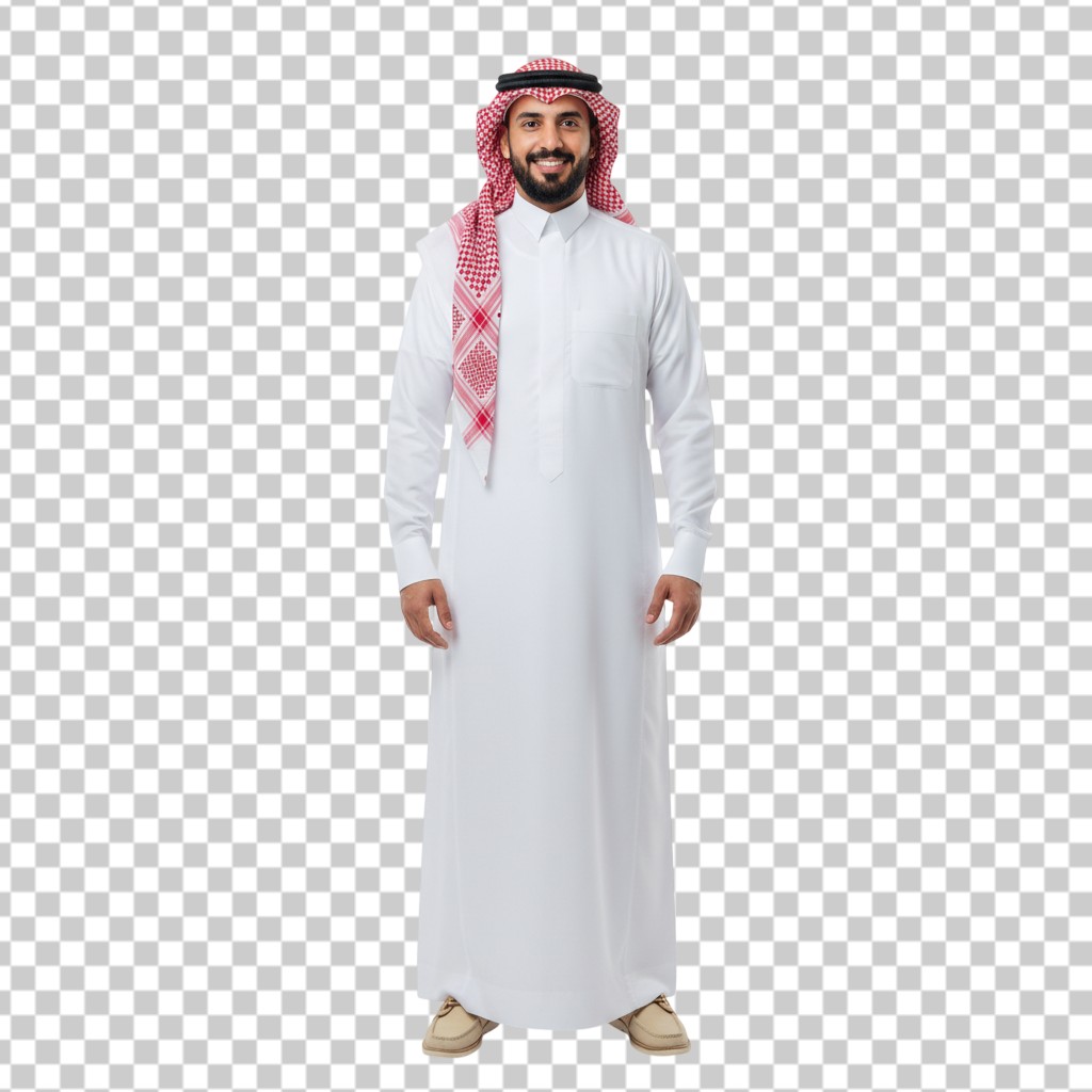 Traditional Arab Man in White Thobe and Red Ghutra Standing Full Body View PNG Transparent Background