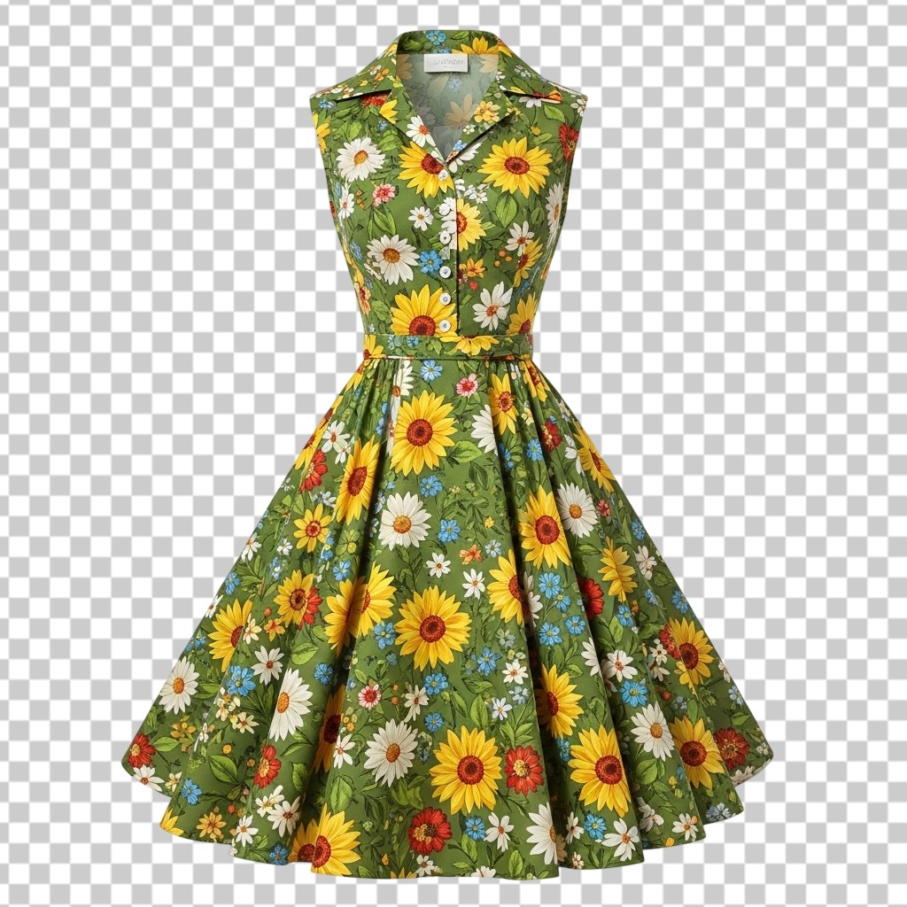 Vintage Style Summer Dress with Sunflower Print PNG Transparent Background