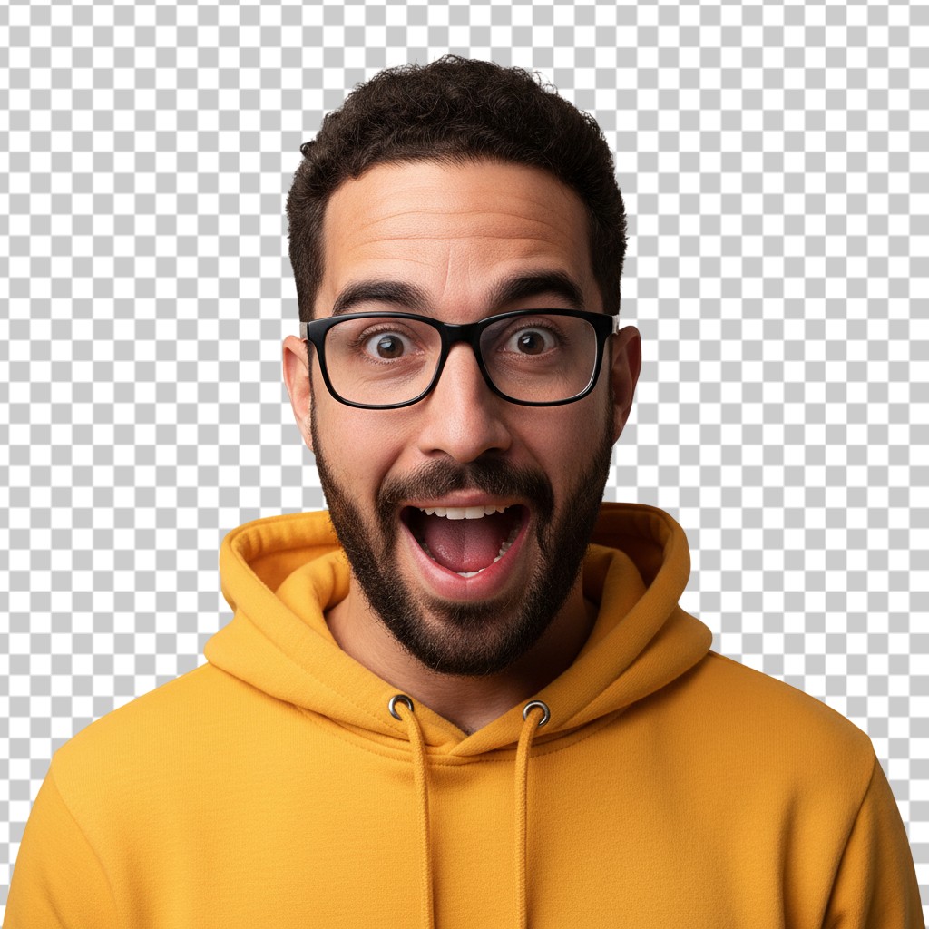 Excited man in yellow hoodie with surprised expression PNG Transparent Background,People