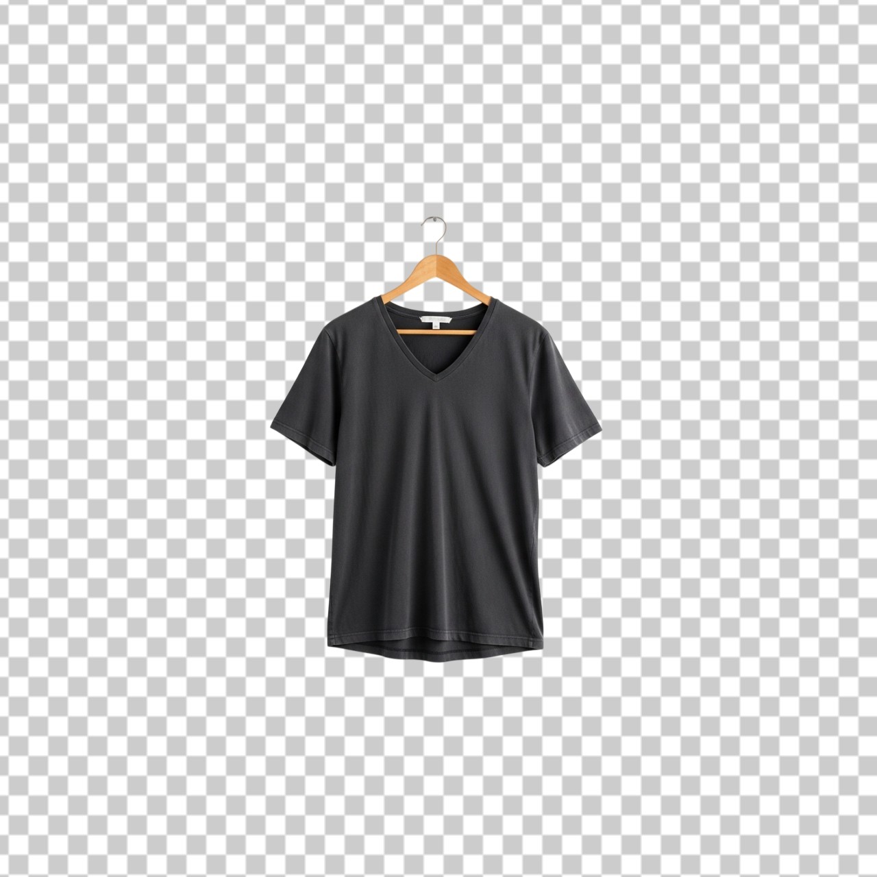 Classic Plain Black Cotton T-Shirt Hanging on a Wooden Hanger PNG Transparent Background