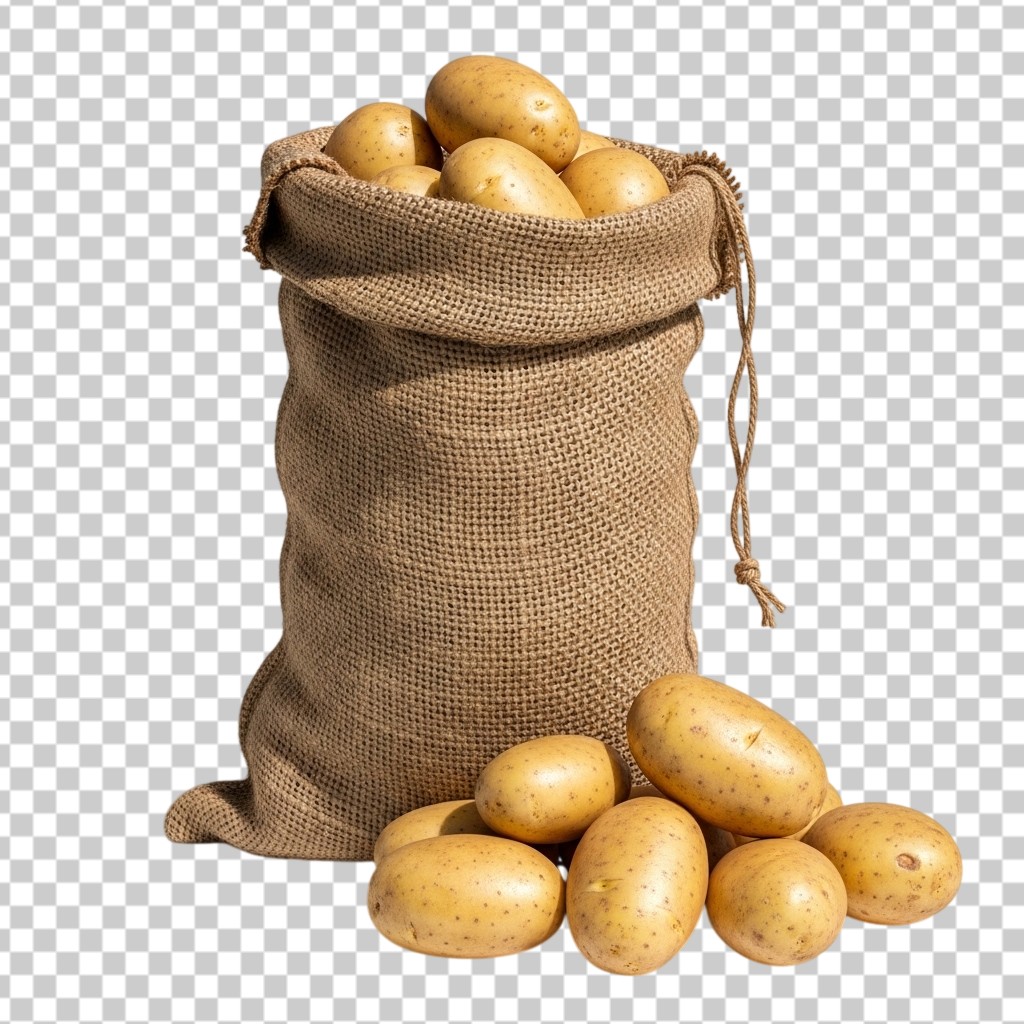 Burlap Bag filled with Fresh Brown Potatoes PNG Transparent Background