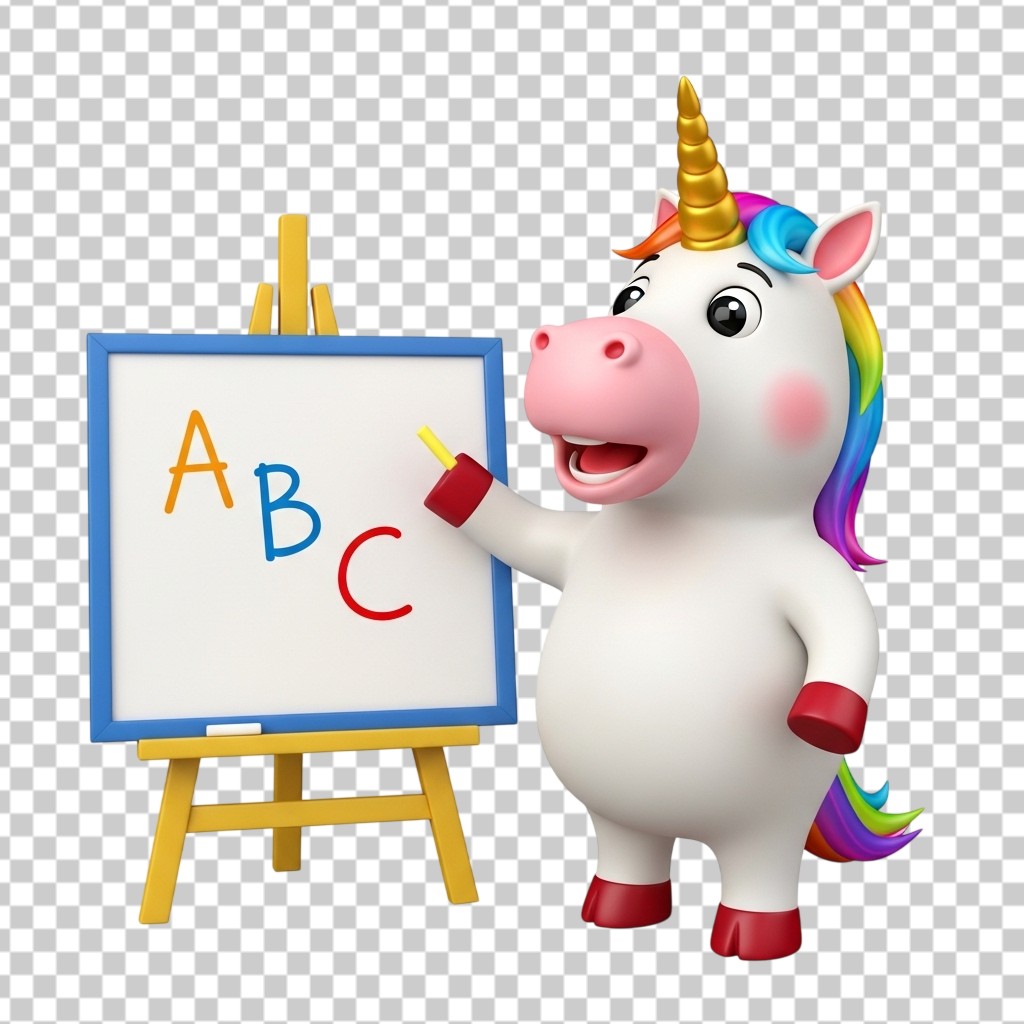 3D Cute Unicorn Character Teaching ABC on Whiteboard PNG Transparent Background