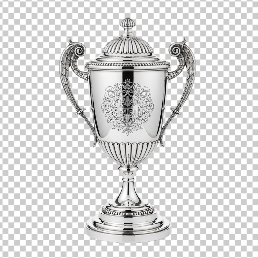 Ornate Silver Championship Trophy Cup with Intricate Engravings PNG Transparent Background