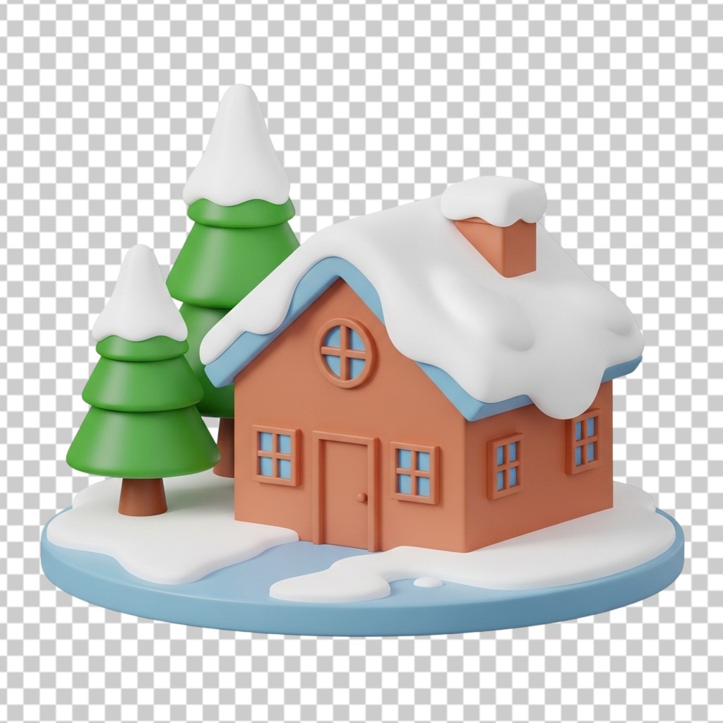 Snowy Winter House with Pine Trees 3D Illustration PNG Transparent Background