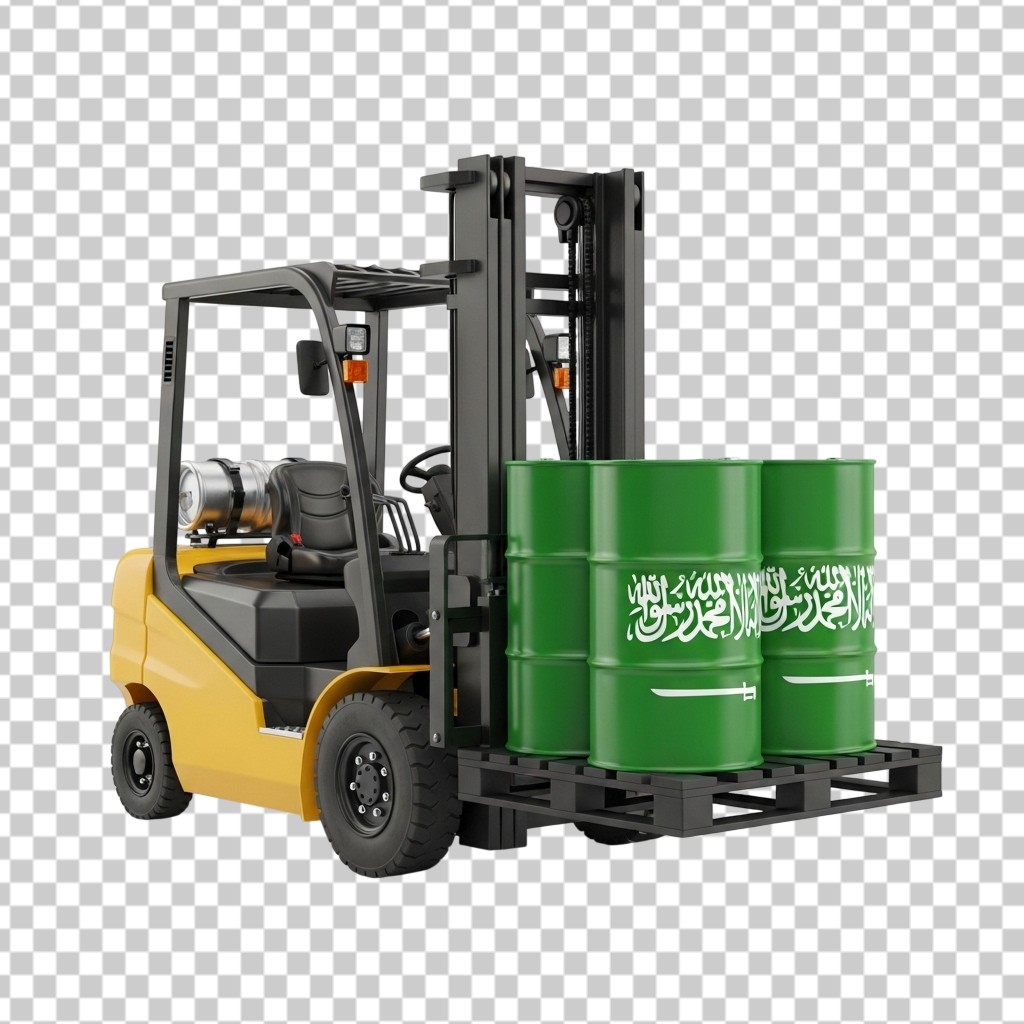Industrial Yellow Forklift Truck Carrying Green Oil Barrels PNG Transparent Background