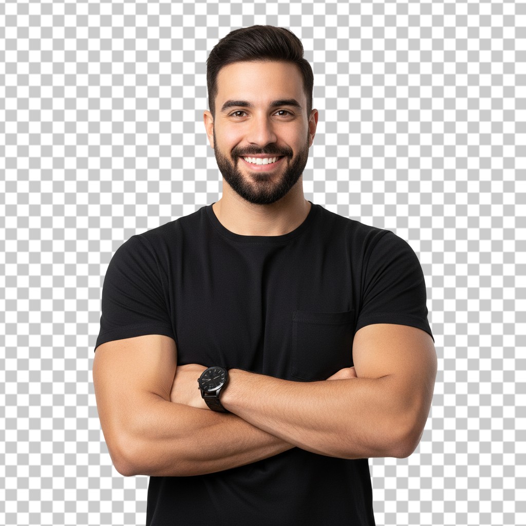 Handsome Smiling Man in Black T-shirt with Crossed Arms PNG Transparent Background