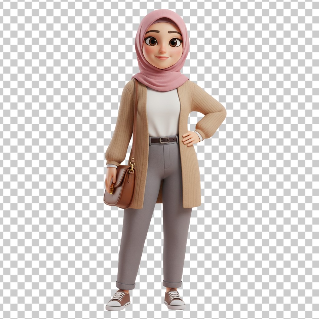 Stylish Young Woman in Hijab and Trench Coat 3D Character PNG Transparent Background