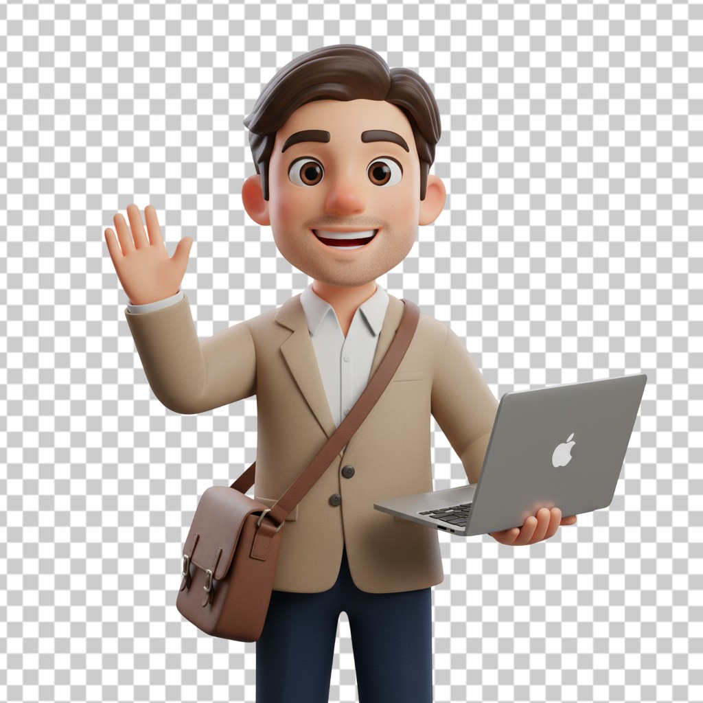 3D Professional Business Man with Laptop and Shoulder Bag Illustration PNG Transparent Background