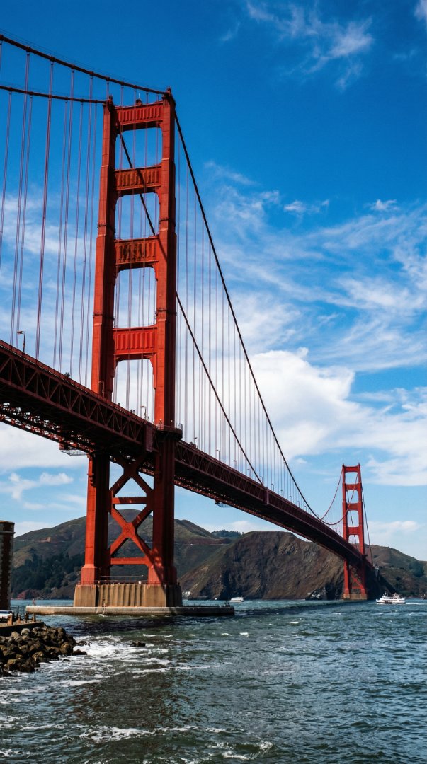 A stunning vertical shot of the famous San Francisco bridge showing its massive suspension cables and scenic bay views. Ideal for mobile wallpapers.