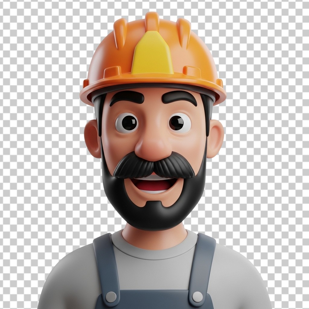 Male Construction Worker Character with Yellow Hard Hat 3D PNG Transparent Background