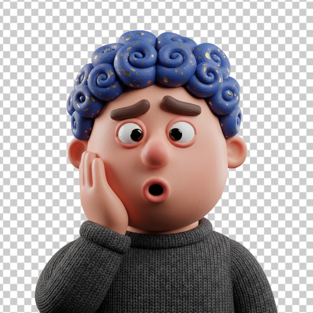 3D Worried Man Avatar with Blue Curly Hair PNG Transparent Background